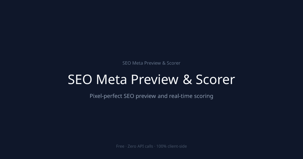 SEO Meta Preview & Scorer is a free browser-based tool that checks 12 SEO signals across 4 preview formats. It validates title tags against Google's 60-character and 600-pixel limit, scores meta descriptions on a 0–100 scale against the 155–160 character optimal range, and detects truncation across Google desktop, Google mobile, Bing, and Open Graph social cards. The scoring formula weights title tags at 40%, meta descriptions at 40%, and keyword placement at 20%.